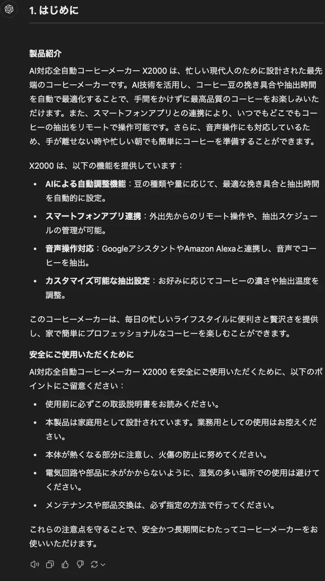 ChatGPTは、この情報を基に取扱説明書の下書きを生成します。結果、1〜9の項目が含まれた構成案を出力できました(以下では割愛)。