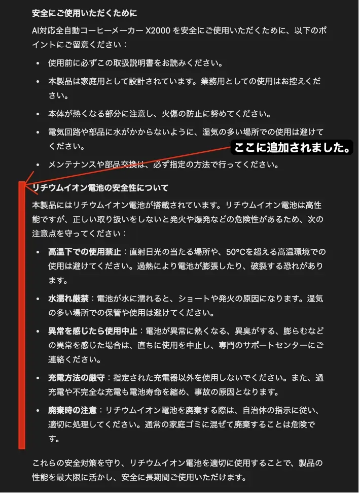 「リチウムイオン電池の危険性を追記してください」と指示します。