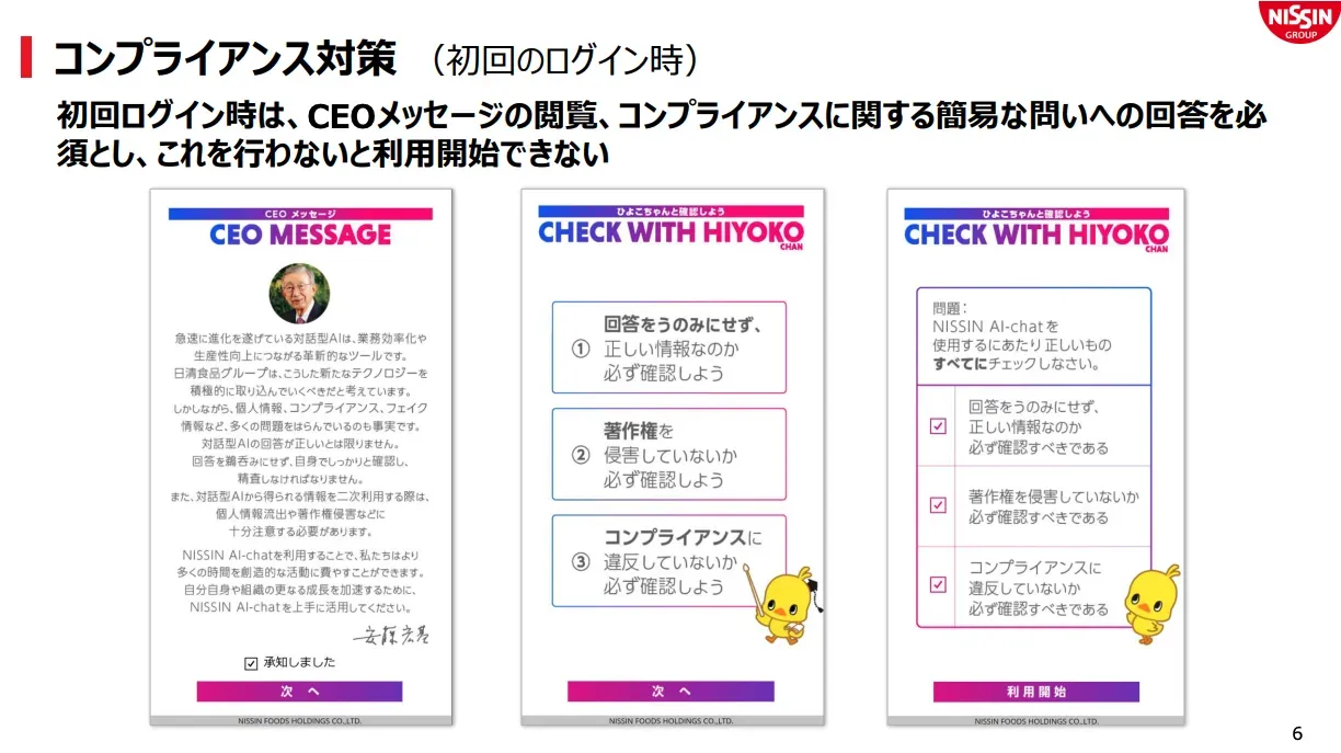 初回ログイン時にはCEOメッセージの閲覧と簡易な問いへの回答を必須とし、2回目以降のログインでは、ひよこちゃんキャラクターによる注意喚起を表示するという継続的な啓発を行うことでコンプライアンスにも対策が施されています。