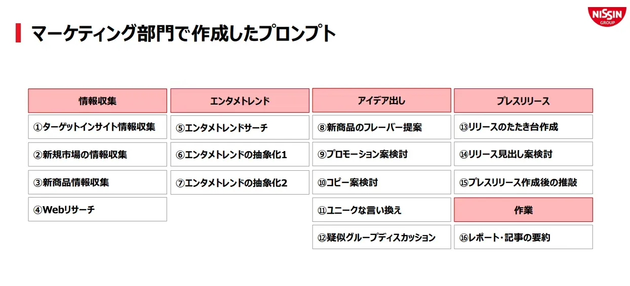 また、マーケティング部門では、情報収集からアイデア出し、プレスリリース作成まで多岐にわたる用途でAIを活用しています。具体的なプロンプトテンプレートを作成し、効率的な利用を促進している点もポイントです。