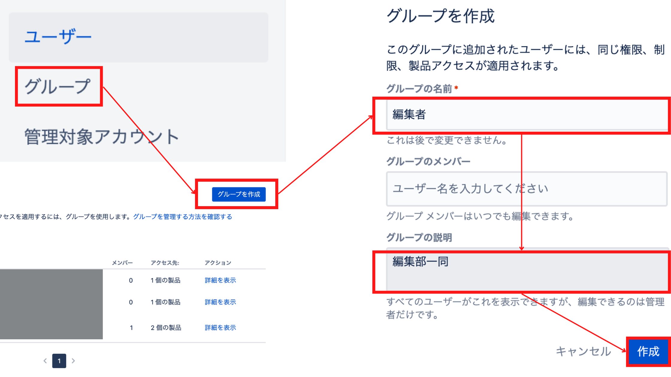 グループの作成は、「名前」「メンバー」「説明(どのようなグループか)」を記述し、作成を押すだけです。