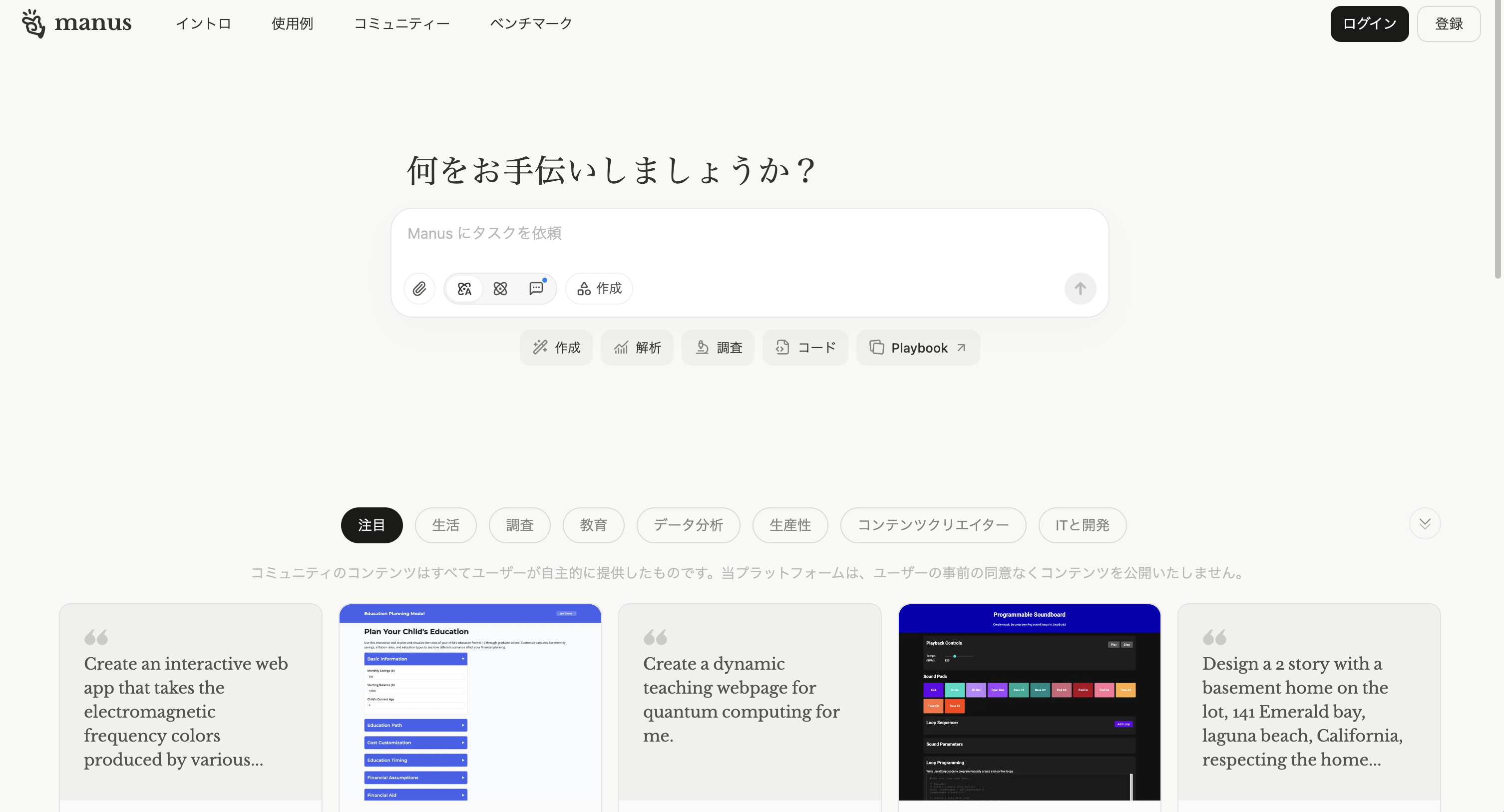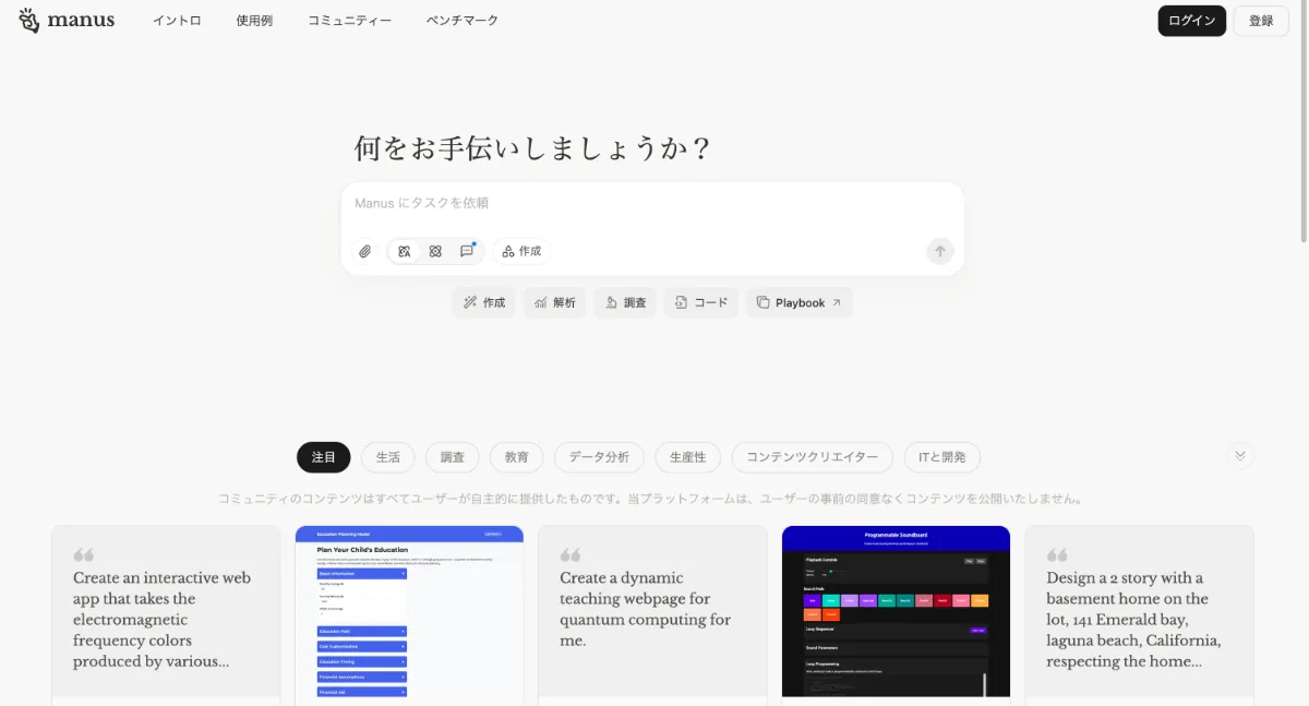 Manus: プロンプトに基づいてスライド、Webサイト、ドキュメントなどを自動生成するAIエージェントツール。